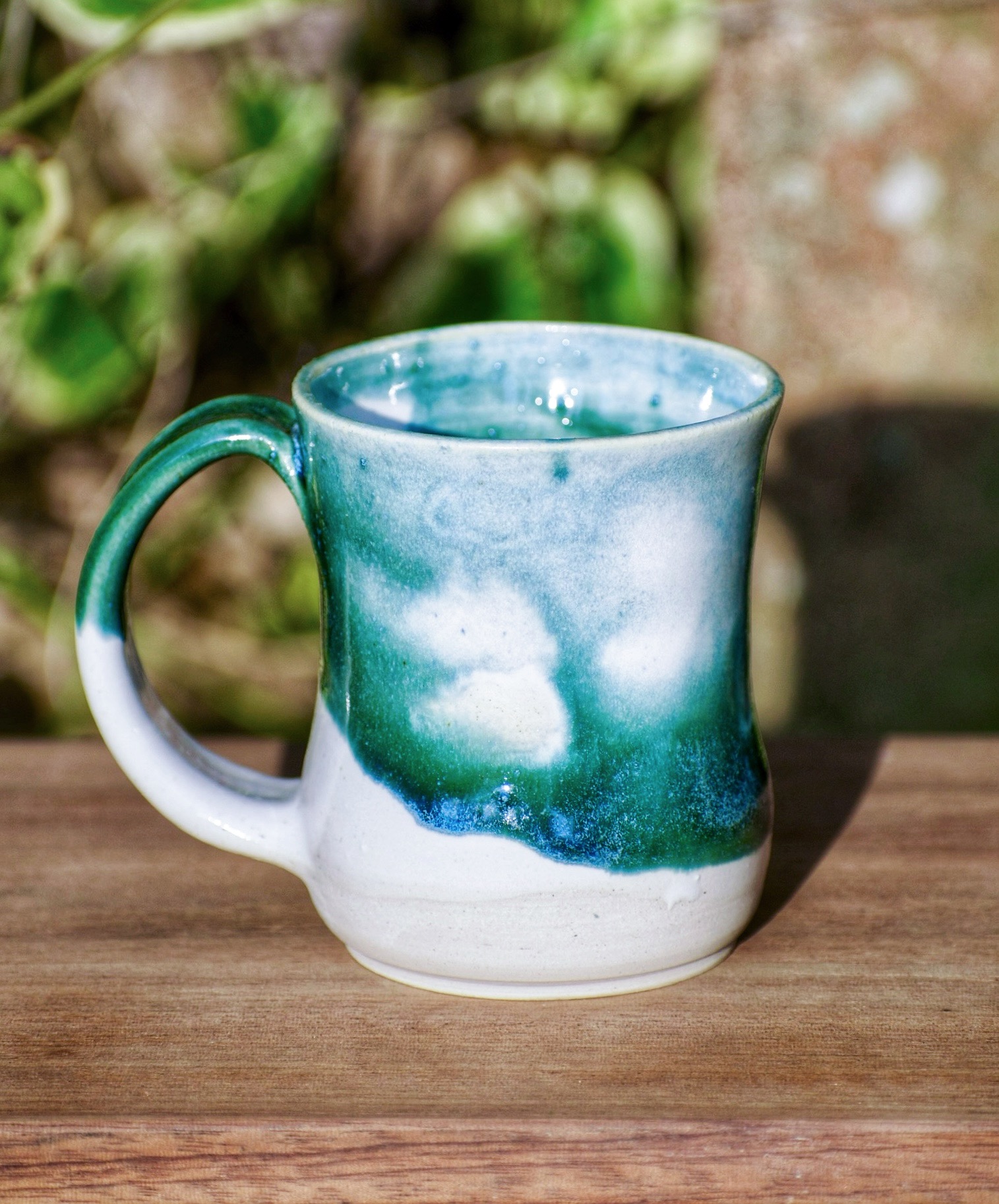 This awesome handmade mug is dripping with a sweet ocean swell glaze! It’s made of a comfy wheel thrown form and hand pulled handle making it the perfect vessel to cradle about 10 fluid ounces of your favorite hot or cold beverage!