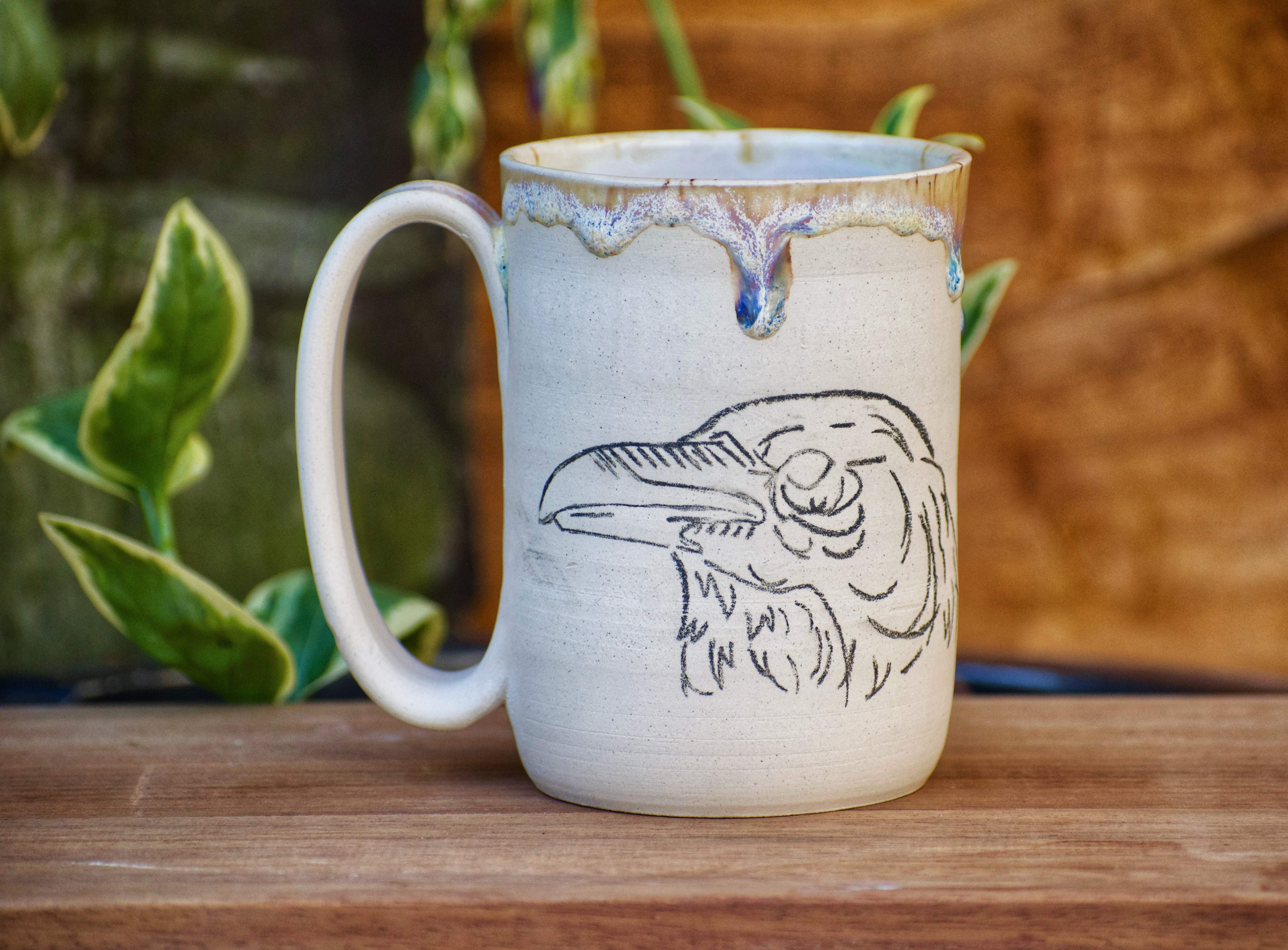 Crows often represent adaptation and wisdom. Embrace these qualities in your life with this awesome handmade mug. It’s made of a comfy wheel thrown form and a hand pulled handle making it the perfect vessel to cradle about 12 fluid ounces of your favorite hot or cold beverage!