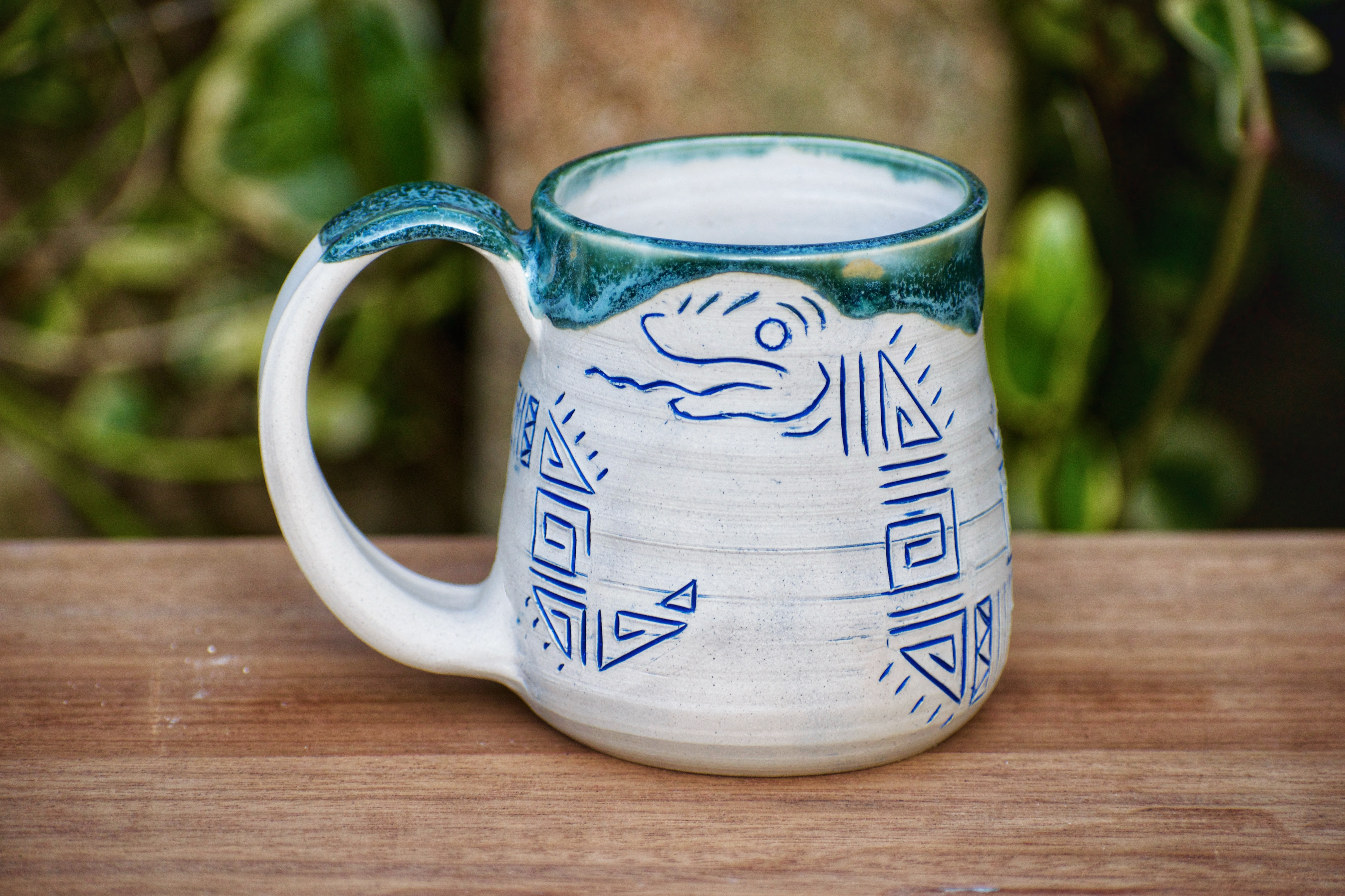 Snakes often represent transformation and rebirth. Embrace these qualities in your life with this awesome handmade mug. It’s made of a comfy wheel thrown form and a hand pulled handle making it the perfect vessel to cradle about 10 fluid ounces of your favorite hot or cold beverage!