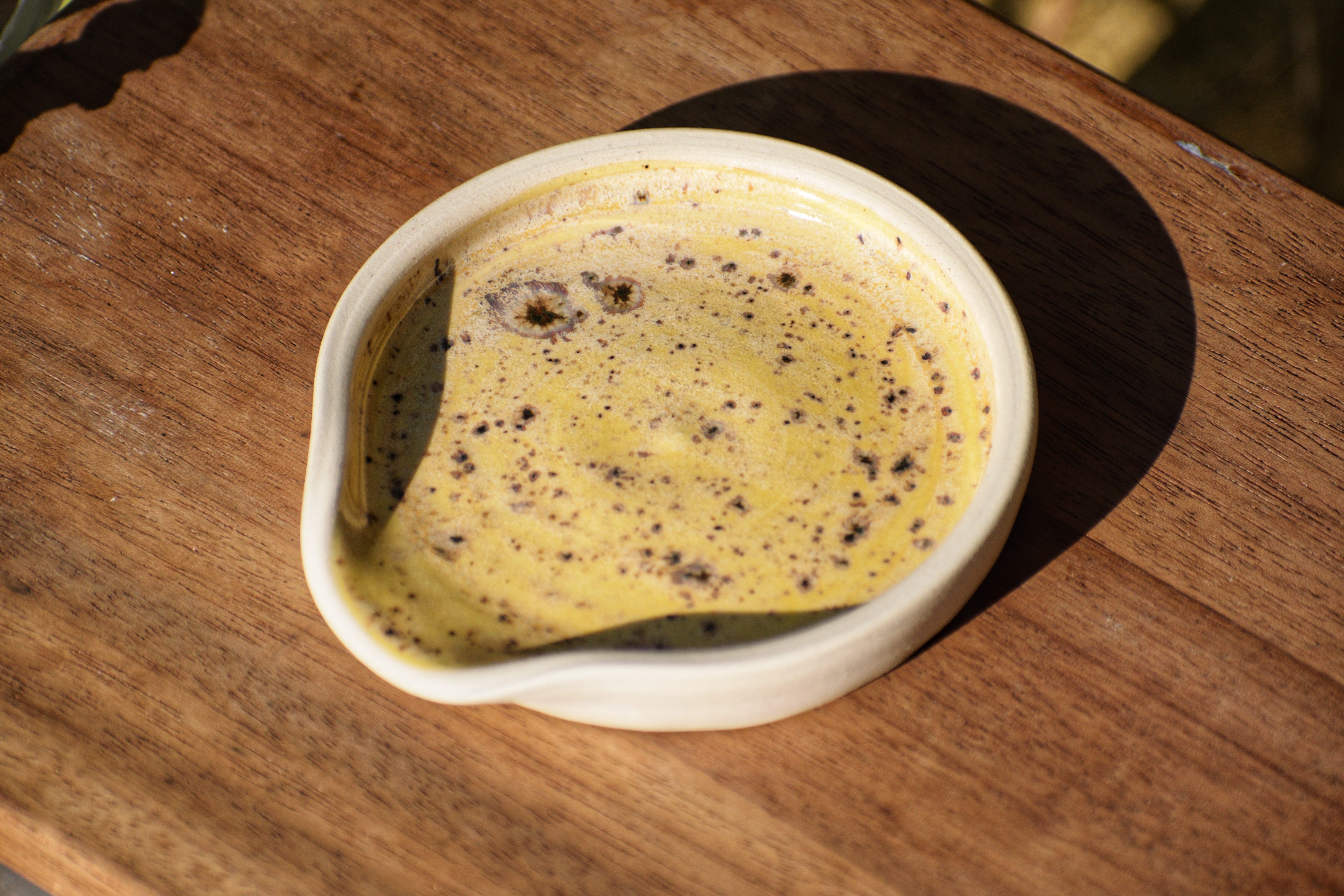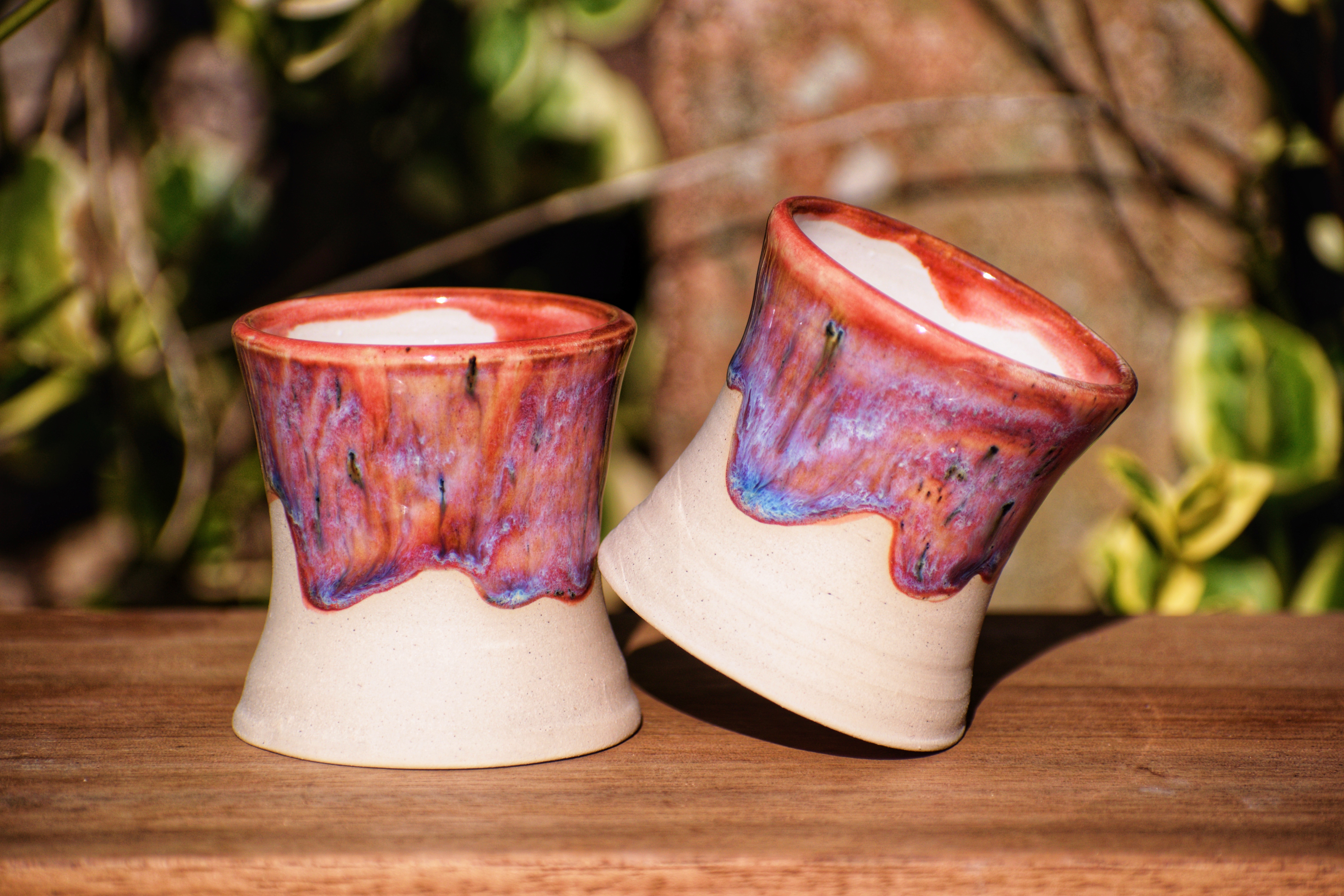 These sick little espresso cups are coated in an awesome drippy lava glaze – with swirls of reds, oranges, and more! They each hold about 6 fluid ounces ( about 178 ml), the perfect size for an espresso, macchiato, or cortado.