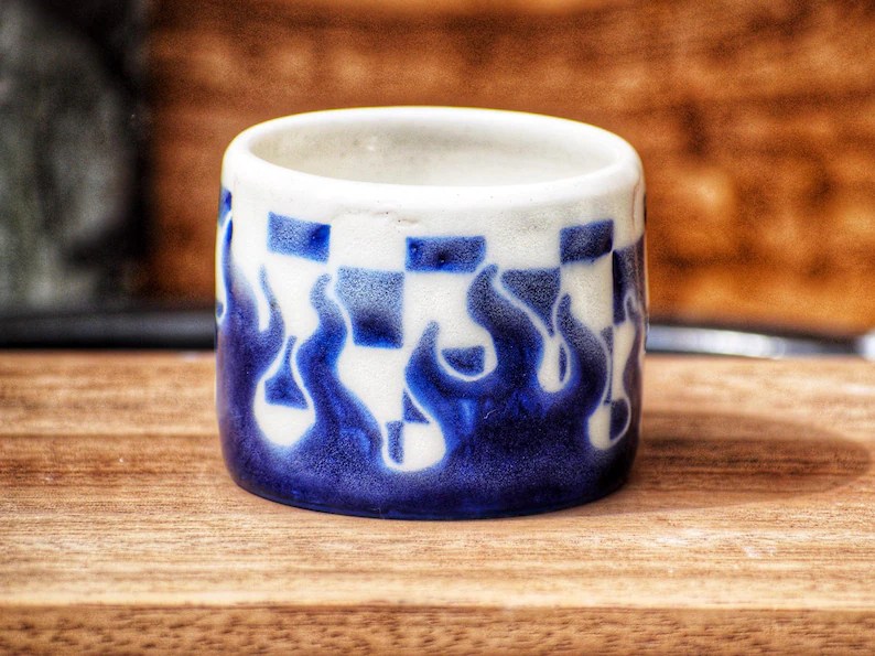 This awesome cup is hand painted with a nostalgic flame and checker combo! It holds about 7.6 fluid ounces ( about 225 mL), the perfect size for a warm tea or small coffee (espresso, macchiato, or cortado). Jam to some Avril Levine and sip your favorite drink with this uniquely 90s cup.