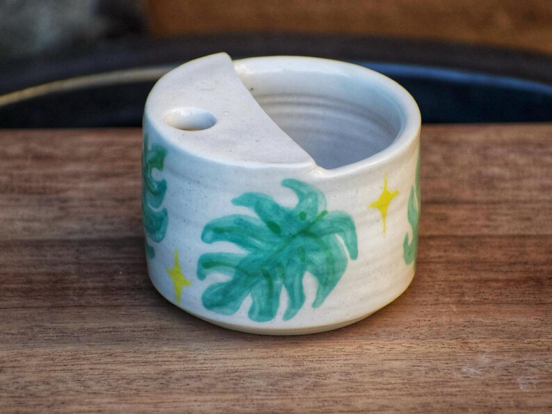 This beautiful hand-painted cup sports sweet monstera leaves for houseplant lovers! It holds about 6.75 fluid ounces (about 200 mL), the perfect size for a pick-me-up espresso. Elevate your sipping experience and cozy up after plant watering duties with this unique sipper cup.