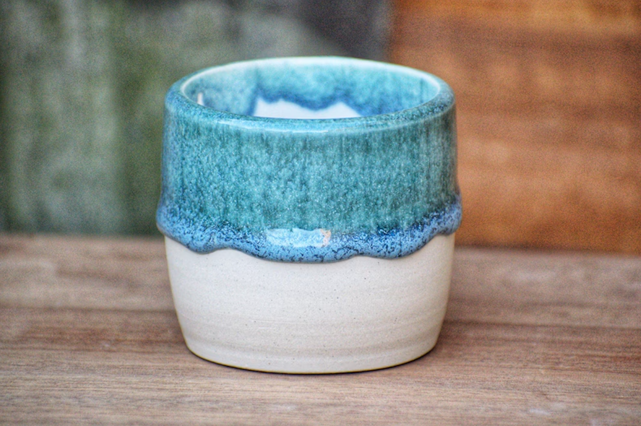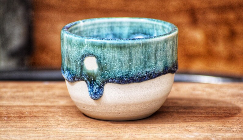 This beautiful cup is coated in a drippy ocean crash glaze – with swirls of blues, teals, and more! It holds about 6 fluid ounces ( about 180 mL), the perfect size for a warm tea or small coffee (espresso, macchiato, or cortado). Elevate your sipping experience and get cozied in with this unique cup.