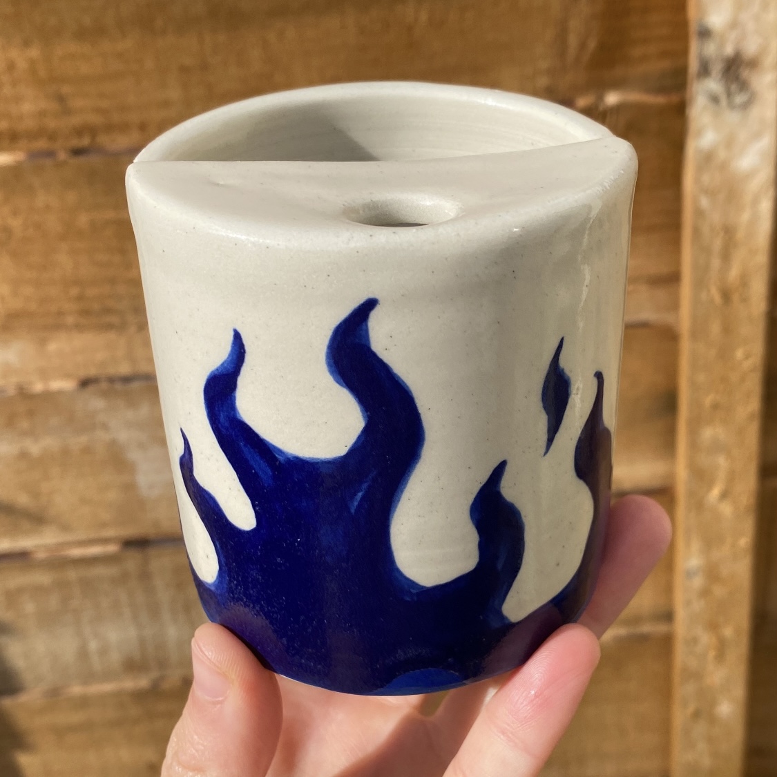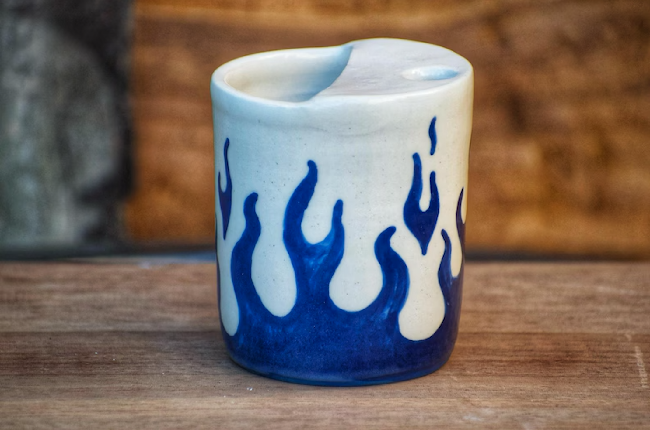 This awesome cup is hand painted with a nostalgic 90’s flame pattern! It holds about 7 fluid ounces ( about 210 mL), the perfect size for a warm tea or small coffee (espresso, macchiato, or cortado). Jam to some Avril Levine and sip your favorite drink with this uniquely 90s sipper cup.