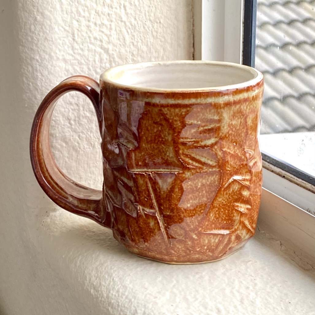 This awesome handmade mug is carved to resemble the organic texture of a mountainside or cliff. It’s dripping with my sweet desert sands glaze – swirling hues of orange, yellow, and tans! It’s made of a comfy wheel thrown form and hand pulled handle make it the perfect vessel to cradle about 11 fluid ounces (325mL) of your favorite hot or cold beverage!